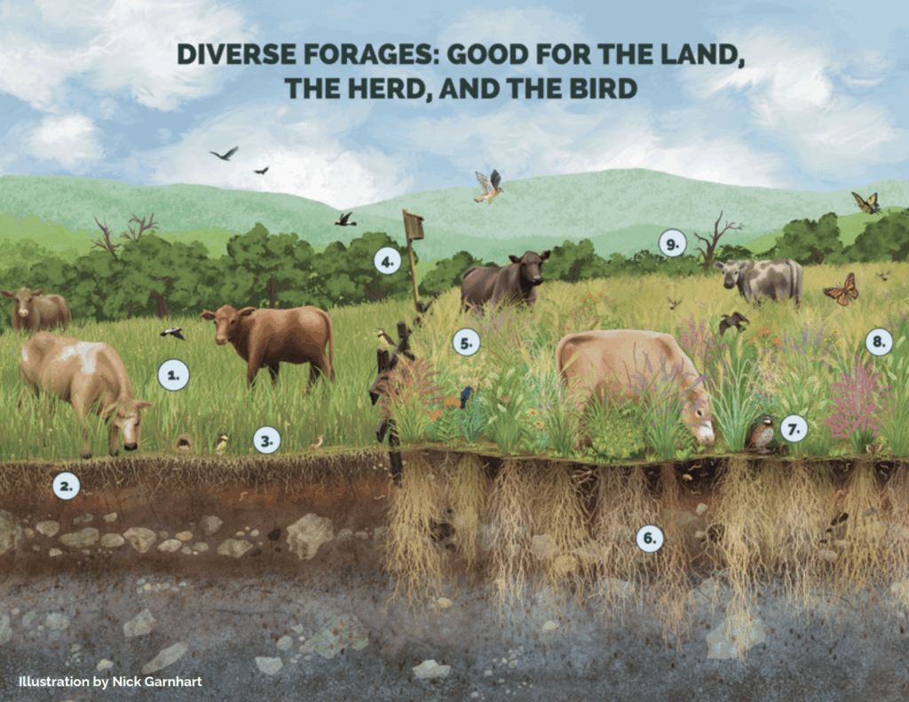 Virginia Grassland Bird Initiative core partners, with the support of VA Cooperative Extension, released a new 2-page resource that showcases the myriad benefits of diversifying forages for beef cattle, with an emphasis on cattle health and wildlife conservation